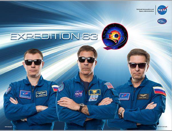 Poster de la tripulación inicial, ahora disuelta, de la Expedición 63. De izda. a dcha. Tikhonov, Cassidy, Babkin. Imagen NASA